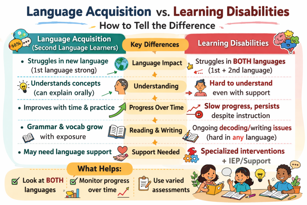 Language acquisition and learning disabilities can look similar on the surface. Both may involve slow reading progress, limited written expression, difficulty following academic language, or frustration during independent work.